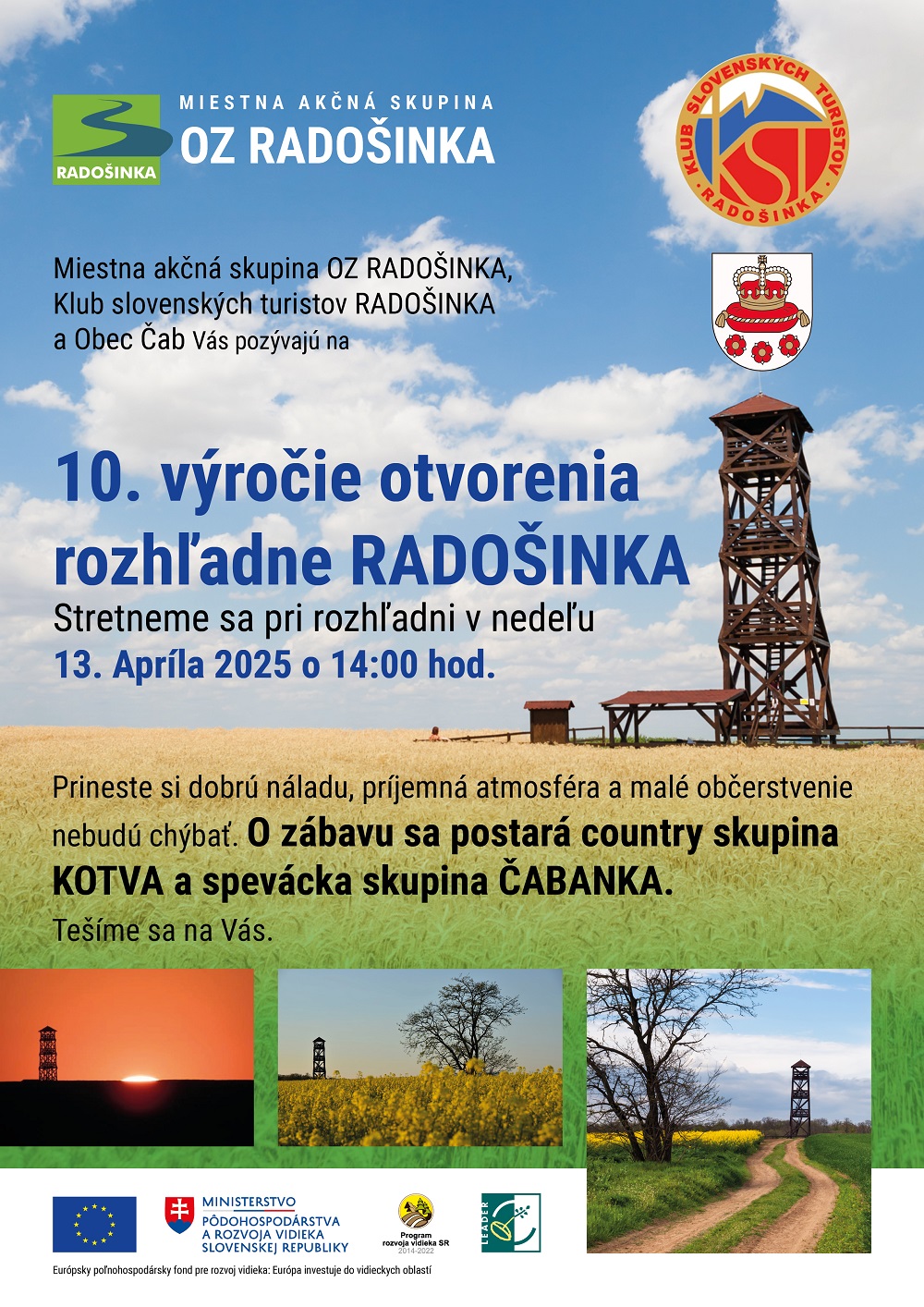 V spolupráci s Klubom slovenských turistov RADOŠINKA a obcou Čab si Vás dovoľujeme srdečne pozvať na tradičné stretnutie pri príležitosti 10. výročia otvorenia rozhľadne RADOŠINKA.