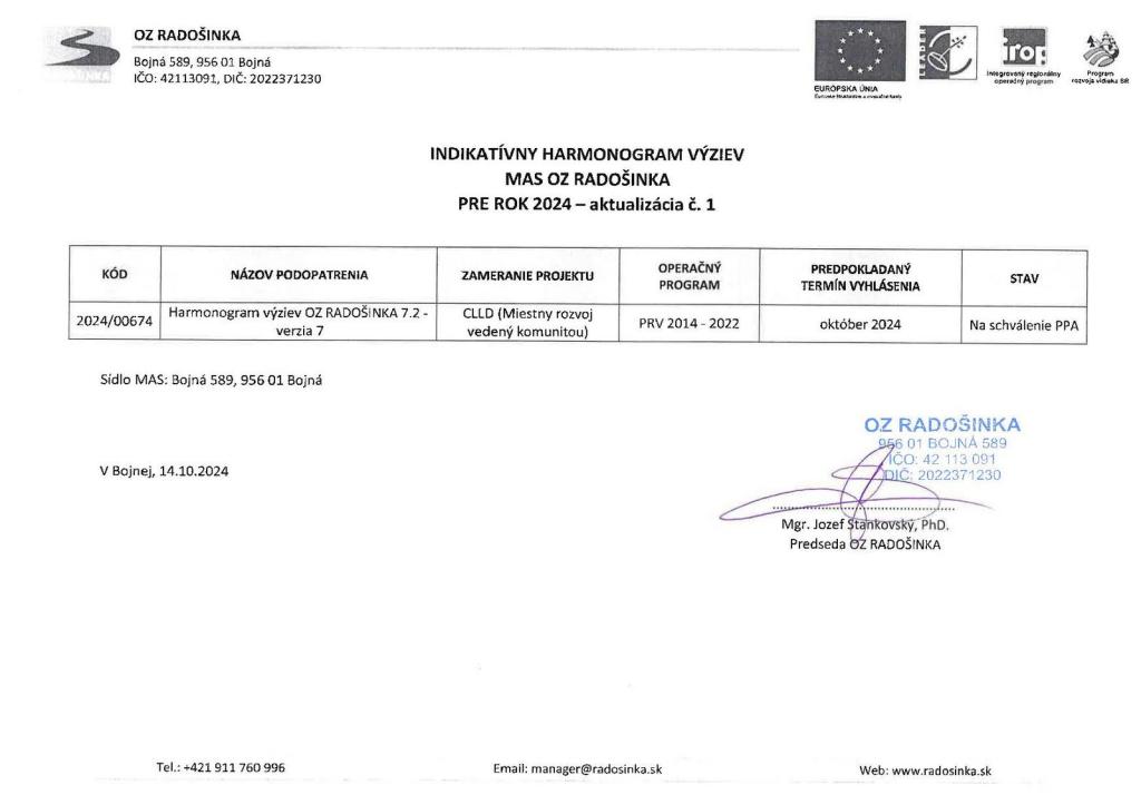 Aktuálny harmonogram výziev PRV OZ RADOŠINKA na rok 2024 (aktualizácia zo dňa 14.10.2024).