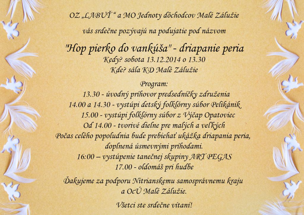 OZ "LABUŤ" a MO Jednoty dôchodcov Malé Zálužie Vás srdečne pozývajú na podujatie pod názvom „Hop pierko do vankúša“ – driapanie peria.