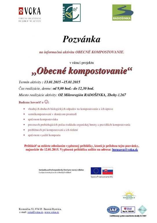 VOKA - Vidiecka organizácia pre komunitné aktivity v spolupráci s MAS OZ MR RADOŠINKA, si Vás dovoľujú pozvať na informačnú aktivitu na tému: "Obecné kompostovanie”.