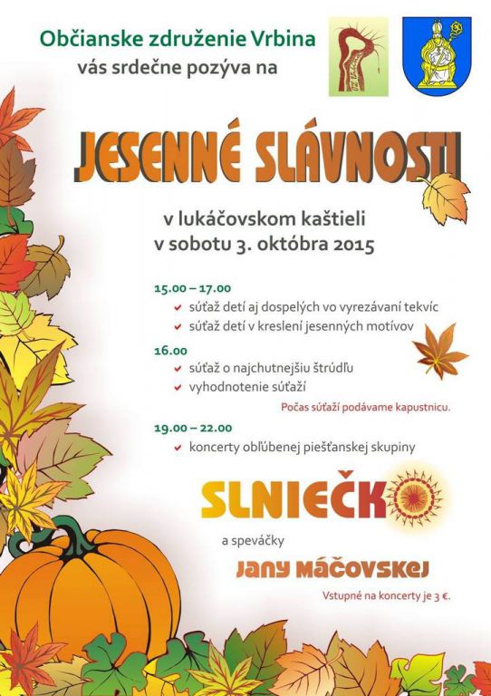 Milí priatelia, Občianske združenie Vrbina a obec Lukáčovce si Vás dovoľujú srdečne pozvať na podujatie JESENNÉ SLÁVNOSTI, v sobotu 3. októbra 2015 v lukáčovskom kaštieli.