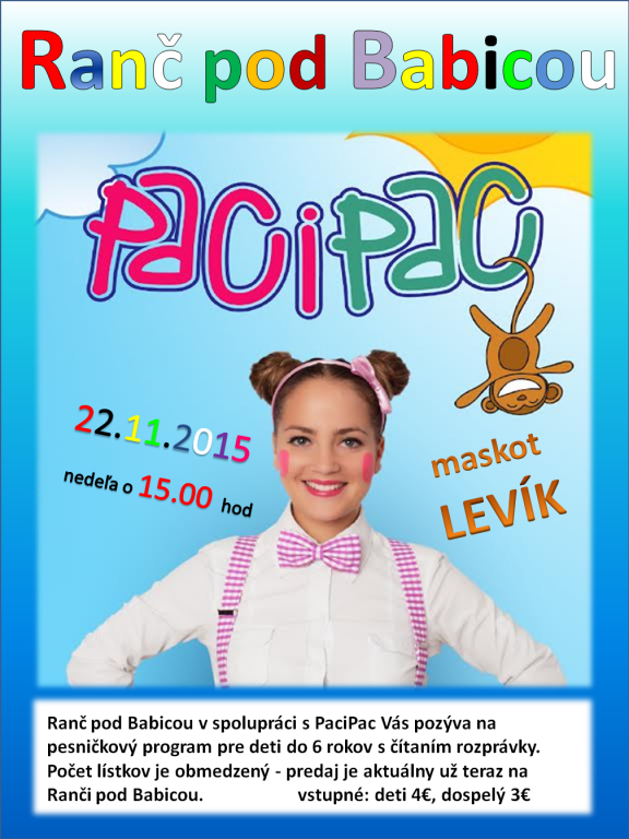 Ranč pod Babicou v spolupráci s PaciPac Vás pozýva na pesničkový program pre deti do 6 rokov s čítaním rozprávky.
