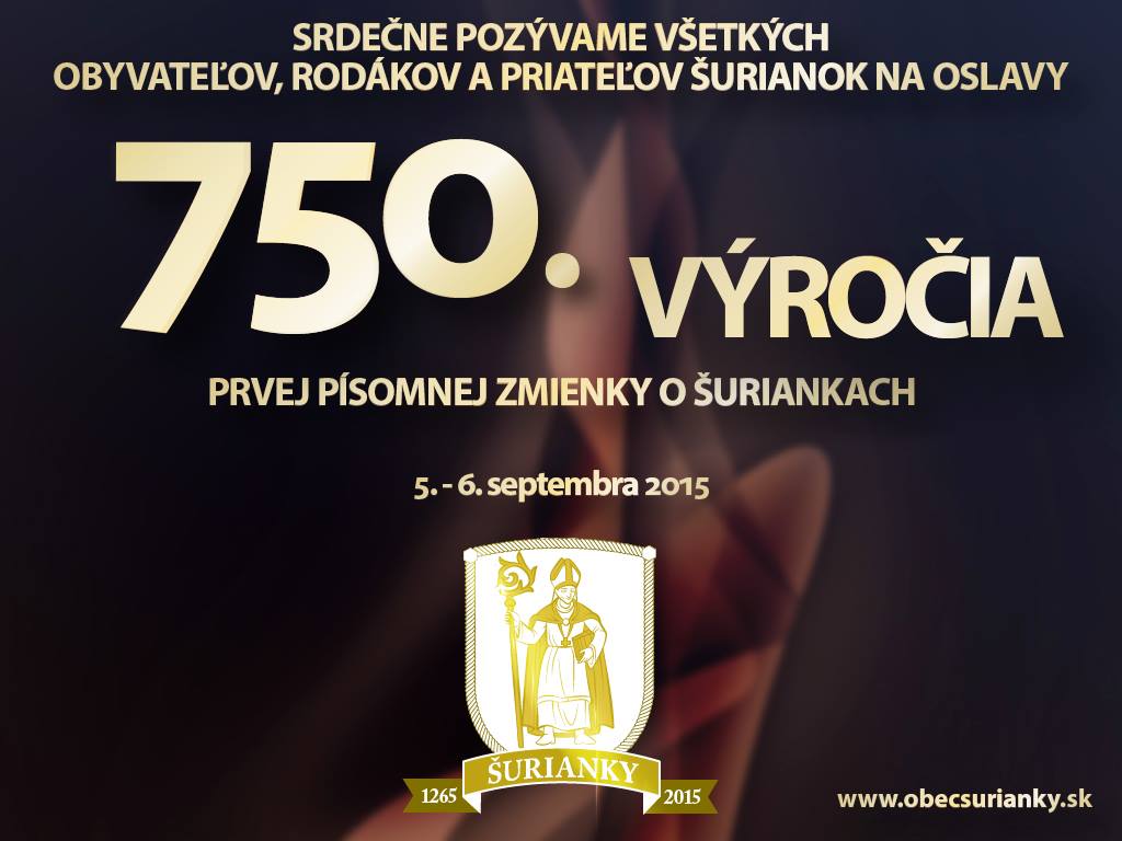 Šurianky750výročieObec Šurianky si Vás dovoľuje srdečne pozvať na oslavy 750. výročia prvej písomnej zmienky o Šuriankach, ktoré sa uskutočnia v sobotu a v nedeľu, t.j. 5.-6. septembra 2015. Súčasťou osláv bude aj predstavenie novej knihy - Šurianky a Emödyovci. Podrobnejší program osláv sa nachádza na webstránke obce: www.obecsurianky.sk
