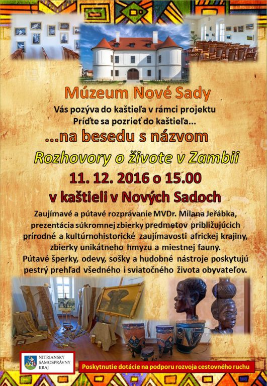 Múzeum Nové Sady Vás pozýva na besedu s názvom ROZHOVORY O ŽIVOTE V ZAMBII. Zaujímavé a pútavé rozprávanie MVDr. Milana Jeřábka spolu s prezentáciou súkromnej zbierky predmetov približujúcich prírodné a kultúrne zaujímavosti africkej krajiny sa uskutoční 11. decembra 2016 so začiatkom o 15:00 hod. v kaštieli v Nových Sadoch.