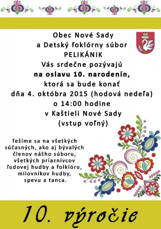 Detský folklórny súbor PELIKÁNIK a obec Nové Sady Vás srdečne pozývajú na oslavu 10. narodenín, ktorá sa bude konať dňa 4. októbra 2015 (hodová nedeľa) v kaštieli rodiny Ghýczy v Nových Sadoch.