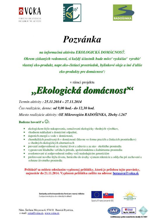 VOKA – Vidiecka organizácia pre komunitné aktivity v spolupráci s MAS OZ MR RADOŠINKA, si Vás dovoľujú pozvať na informačnú, vzdelávaciu aktivitu na tému: “Ekologická domácnosť”, kde okrem vedomostí o tom ako viesť ekologickú domácnosť, si každý účastník bude môcť vyskúšať vyrobiť vlastný eko-produkt, napr. ekologický čistiaci prostriedok, bylinkové oleje a iné ďalšie eko-produkty.
