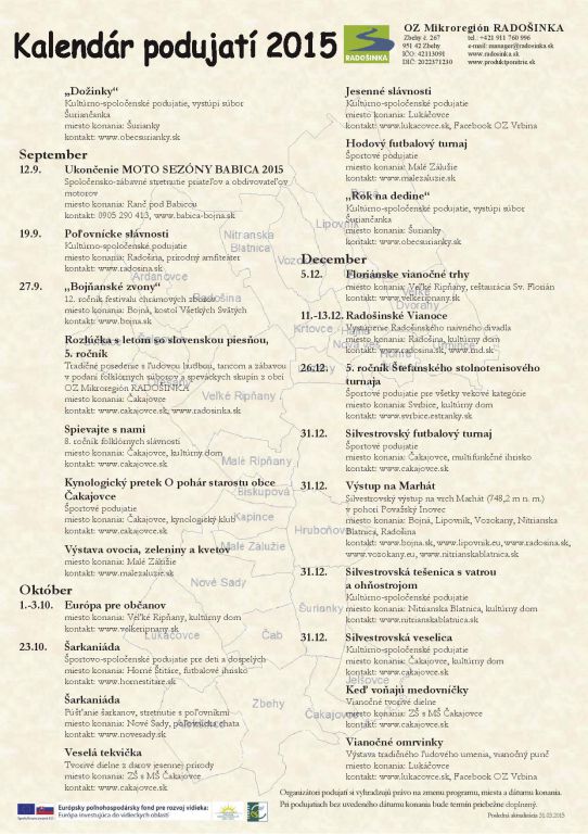 Dávame Vám do pozornosti prehľadný Kalendár podujatí obcí, združení, organizácií a podnikateľských subjektov v územnej pôsobnosti OZ Mikroregión RADOŠINKA.