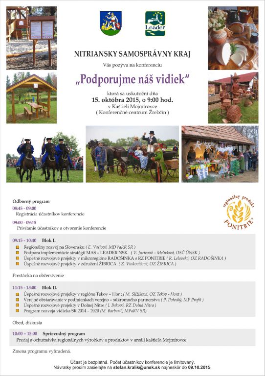 Úrad Nitrianskeho samosprávneho kraja Vás pozýva na konferenciu s názvom „Podporujme náš vidiek", ktorá sa uskutoční dňa 15.10.2015 v Kaštieli Mojmírovce (Konferenčné centrum Žrebčín).