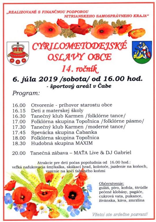 Obec Čab Vás srdečne pozýva na Cyrilometodejské oslavy obce - 14. ročník, ktoré sa uskutočnia v sobotu 6.7.2019 od 16.00 hod. V kultúrnom programe si prídu na svoje malí i veľkí. Srdečne ste pozvaní.