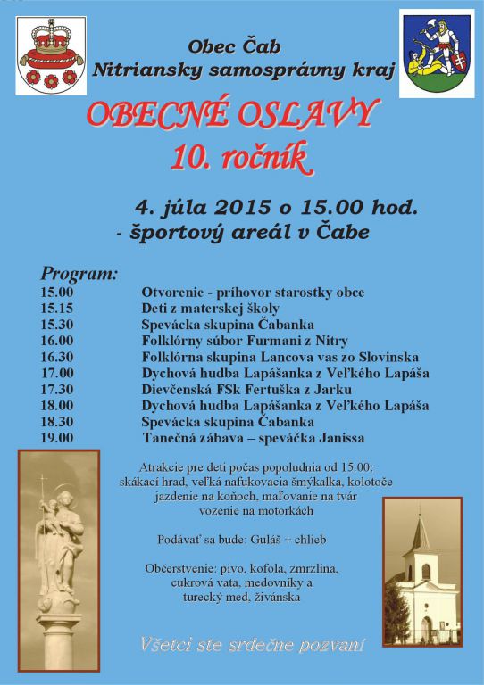 Obec Čab si Vás dovoľuje pozvať na 10. ročník OBECNÝCH OSLÁV, ktoré sa budú konať 4. júla 2015, so začiatkom o 15:00 hod. v priestoroch športového areálu.