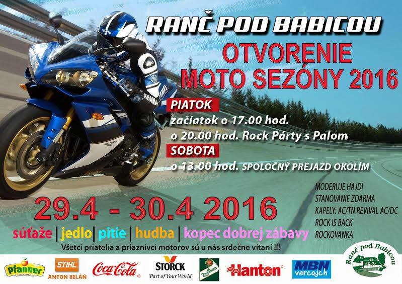 Všetci priatelia a priaznivci motorov sú pozvaní na OTVORENIE MOTO SEZÓNY 2016, 29.4. - 30.4. 2016 na Ranči pod Babicou.