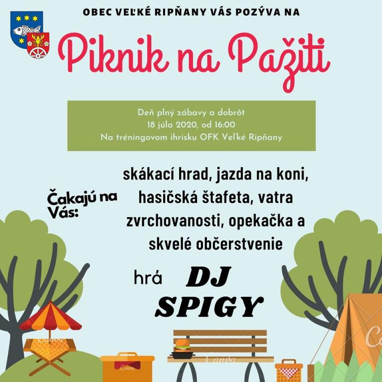 Obec Veľké Ripňany Vás pozýva na Piknik na Pažiti, deň plný zábavy a dobrôt. 18. júla 2020, od 16:00 na tréningovom ihrisku OFK Veľké Ripňany.