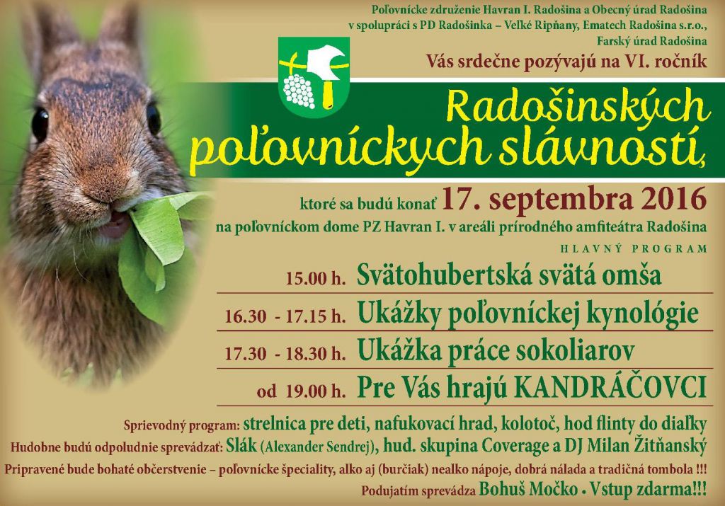 Poľovnícke združenie Havran I. Radošina a Obecný úrad Radošina v spolupráci s PD Radošinka - Veľké Ripňany, Ematech Radošina s.r.o. a Farským úradom Radošina Vás srdečne pozývajú na VI. ročník RADOŠINSKÝCH POĽOVNÍCKYCH SLÁVNOSTÍ, ktoré sa budú konať dňa 17. septembra 2016 na poľovníckom dome PZ Havran I. v areáli prírodného amfiteátra Radošina. Pripravené bude bohaté občerstvenie – poľovnícke špeciality, alko aj nealko nápoje, dobrá nálada a tradičná tombola!