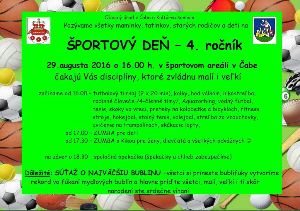 Obec Čab Vás srdečne pozýva na Športový deň - 4. ročník, ktorý sa bude konať 29.8.2016 t.j. v pondelok so začiatkom o 16.00 hod. Všetci ste srdečne vítaní. Príďte si zašportovať a stretnúť sa s priateľmi.