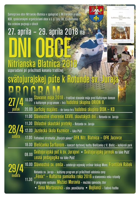 Plagát Svätojurajská púť 2018Plagát Dni obce 2018Prijmite srdečné pozvanie na dni obce Nitrianska Blatnica usporiadané pri príležitosti konania tradičnej svätojurajskej púte k Rotunde sv.  Juraja.