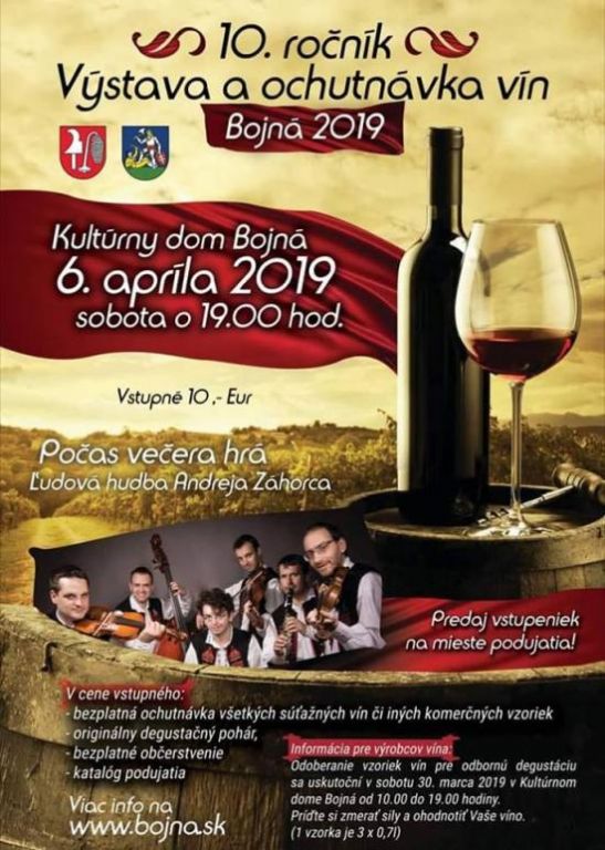 Obec Bojná Vás v sobotu 6. apríla 2019 pozýva na 10. ročník Výstavy a ochutnávky vín Bojná 2019.